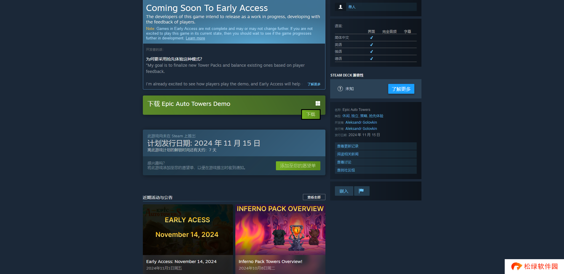 《史诗自动塔防(Epic Auto Towers)》Steam版的上线时间为2024年的11月15日,具体上线时间就是上午六点或者上午十二点左右。
