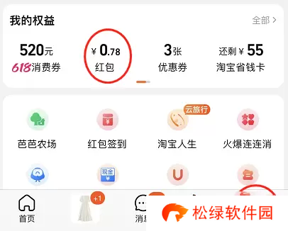 1、进入淘宝,点击右下角的【我的淘宝】,在我的权益这一栏可以看到【红包】;