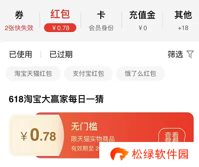 2、点击进入在红包的选项里面可以看到【618淘宝大赢家每日一猜】的无门槛红包,红包是有使用时间限制的大家记得及时使用哦。