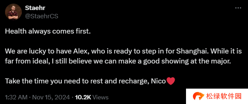 在device宣布缺席上海Major 欧洲RMR后,阿汤哥的队友Staehr在社媒发文感慨并祝愿device早日康复。