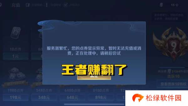上图就是充值系统崩溃的图片,能看到,显示服务器繁忙,出现这个情况的原因只有一个,就是参与活动的玩家实在是太多了,导致王者荣耀的抽奖服务器一时间出现了卡顿。