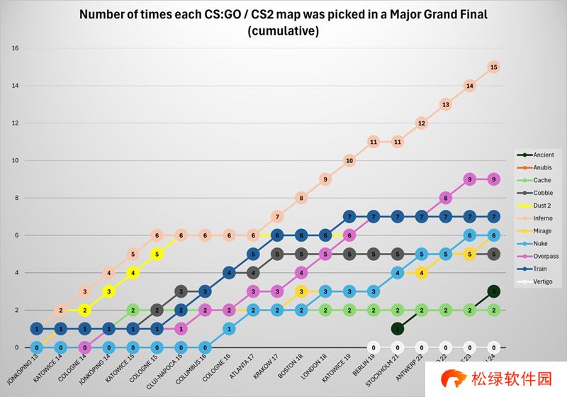 社区统计了Major决赛中的地图采用情况,并将之做成了折线统计图。