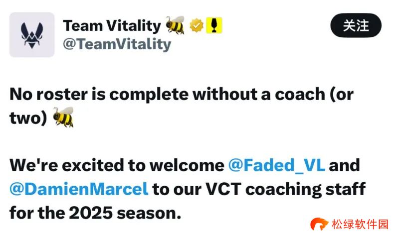 原文如下:没有教练的阵容是不完整的(甚至需要两个) 我们很高兴欢迎Faded 和 DamienMarcel 加入我们的VCT教练团队,共同备战2025赛季。