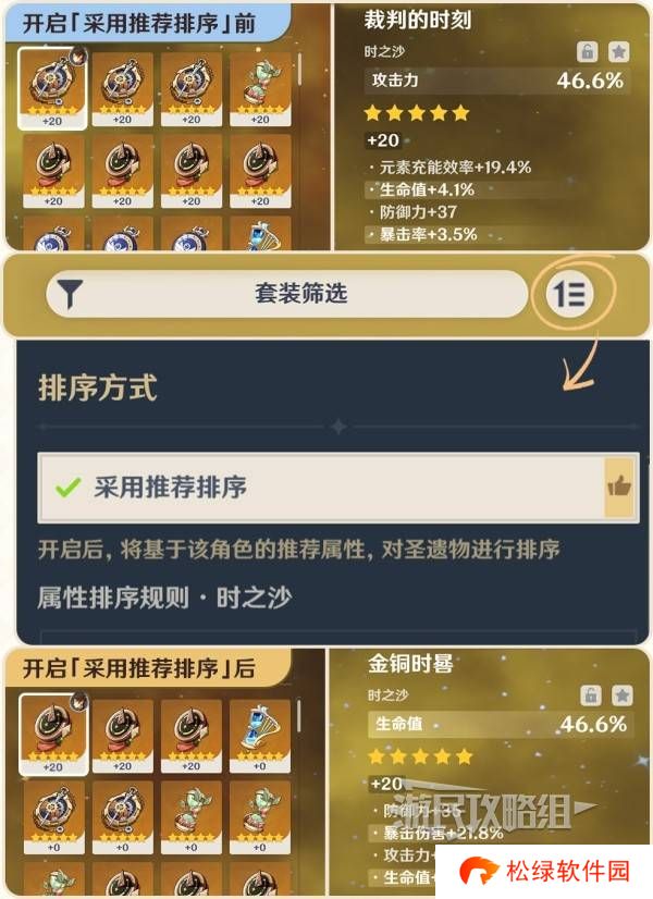 此外,「排序方式」界面新增了「采用推荐排序」选项,该功能将会根据「圣遗物推荐」中的信息,将现有圣遗物按照与角色的适配度进行重新排序,省时省力。注意选择【采用推荐排序】之后将无法单独选择属性。