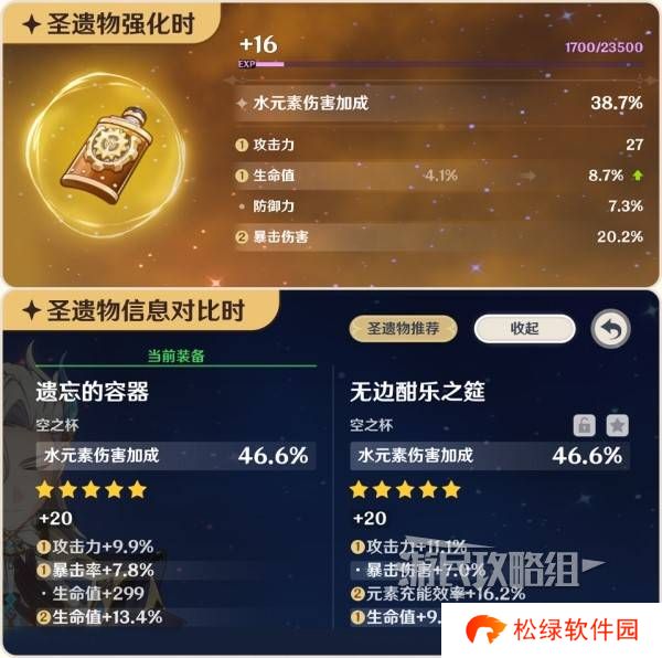 除此之外,为了进一步帮助大家节省计算成本,并快速判断圣遗物培养价值,版本更新后,强化圣遗物或使用对比查看圣遗物信息时,将能够直接了解追加属性的强化次数。推荐属性高亮配合强化次数标记,能够轻松获取角色圣遗物最优解。
