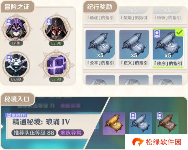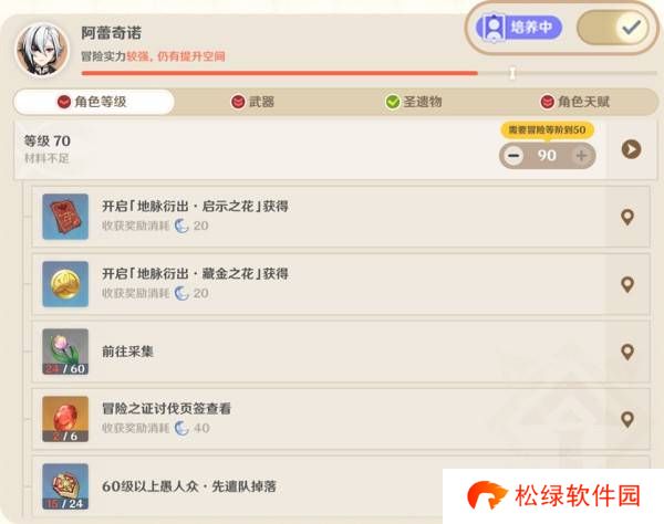 在设定好相应的培养计划后,达成既定目标所缺少的材料,其主要获取途径将会在「冒险之证」中优先展示,并附有特殊的角标提示。在纪行奖励、秘境入口等养成材料获取的常用界面也会出现相应的角标提示。